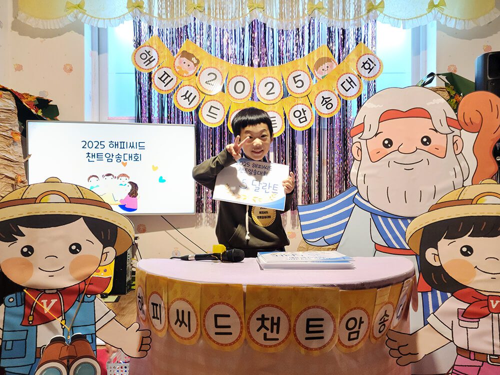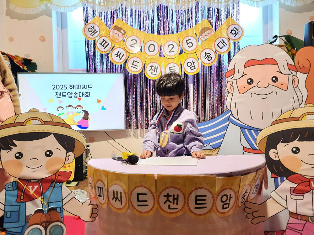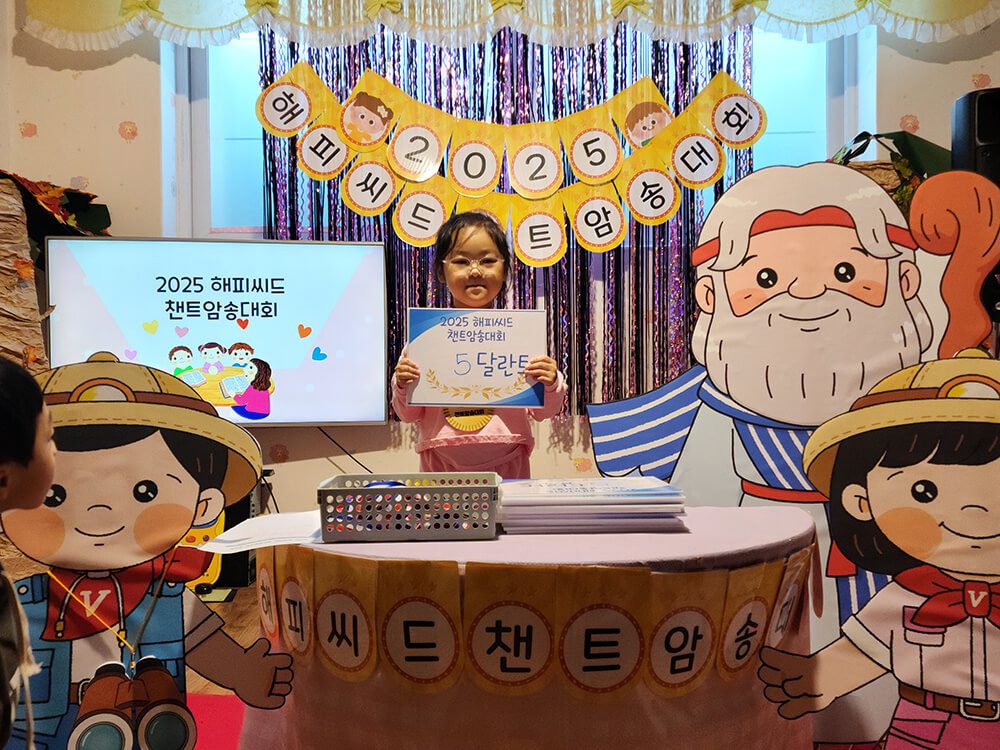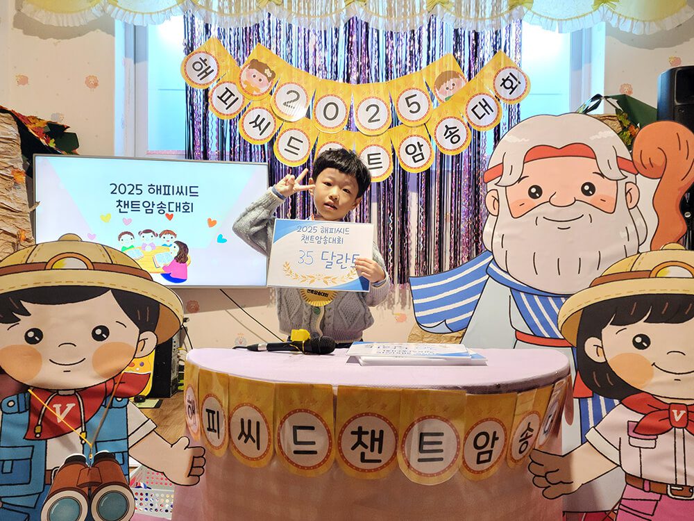 일시: 2025년 10월 26일(주일) 해피씨드 유치부 친구들과 “챈트 암송대회” 진행했습니다!한 해 동안 신나는 찬양과 말씀 챈트를 배우면서쏙쏙 머리에 들어왔던 “말씀 한 줄 한 줄”을친구들 앞에 용기 내서 또박또박 한절한절 암송해보는 시간이였습니다!유치부 모~든 친구들이 함께한 은혜로운 챈트시간! 아이들과 함께 말씀 챈트를 외워주시고힘껏 응원해주신 부모님들께도 감사의 인사를 전합니다. 앞으로도 우리 유치부 친구들이 하나님 말씀을 더 사랑하고, 말씀 안에서 쑥쑥 자라갈 수 있도록 기도 부탁드려요! 🌱우리 친구들 모두 — 정말 정말 수고했어요! 🎉