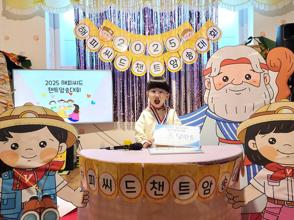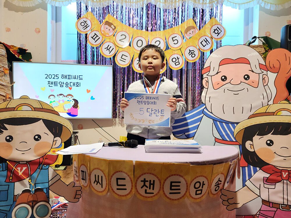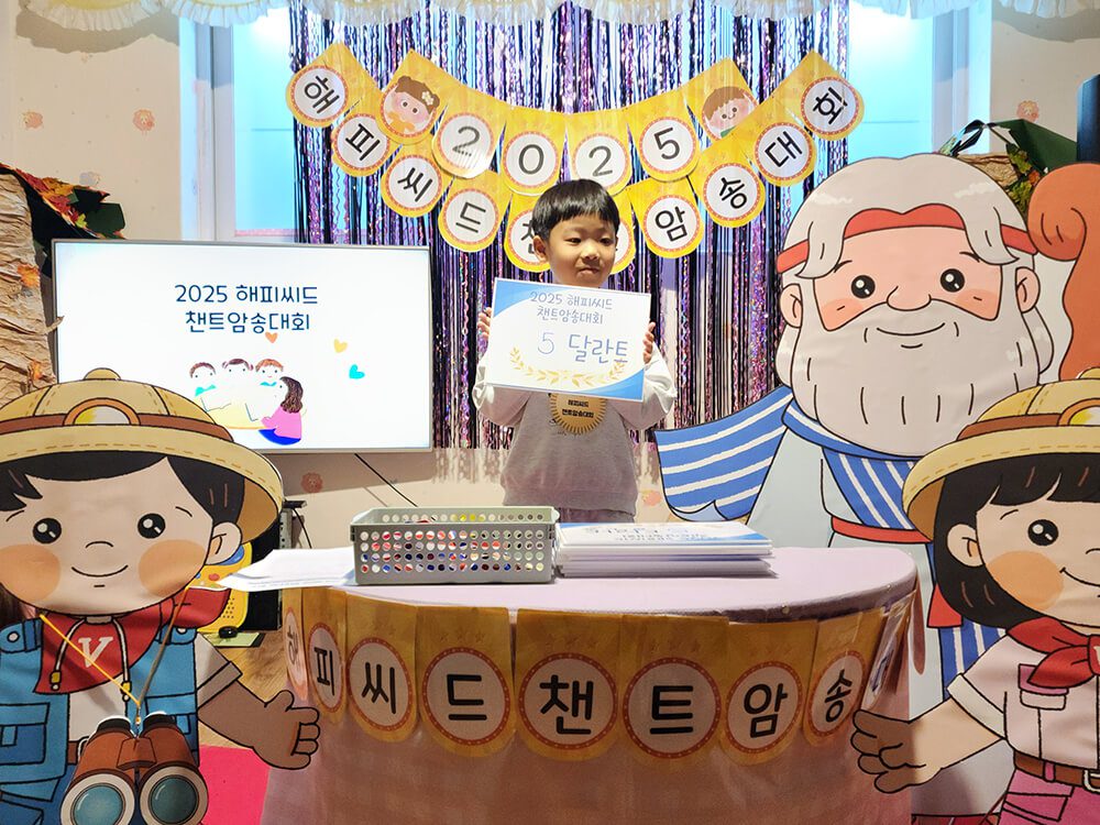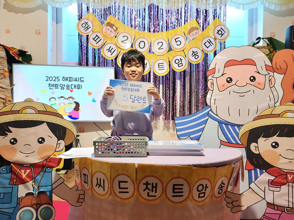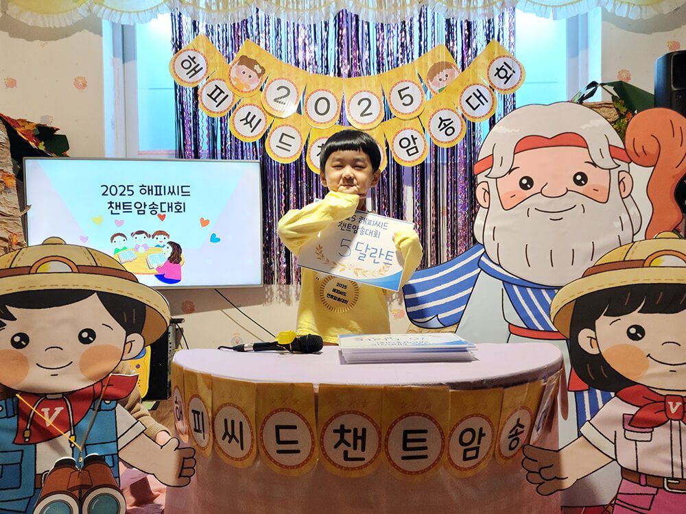 일시: 2025년 10월 26일(주일) 해피씨드 유치부 친구들과 “챈트 암송대회” 진행했습니다!한 해 동안 신나는 찬양과 말씀 챈트를 배우면서쏙쏙 머리에 들어왔던 “말씀 한 줄 한 줄”을친구들 앞에 용기 내서 또박또박 한절한절 암송해보는 시간이였습니다!유치부 모~든 친구들이 함께한 은혜로운 챈트시간! 아이들과 함께 말씀 챈트를 외워주시고힘껏 응원해주신 부모님들께도 감사의 인사를 전합니다. 앞으로도 우리 유치부 친구들이 하나님 말씀을 더 사랑하고, 말씀 안에서 쑥쑥 자라갈 수 있도록 기도 부탁드려요! 🌱우리 친구들 모두 — 정말 정말 수고했어요! 🎉